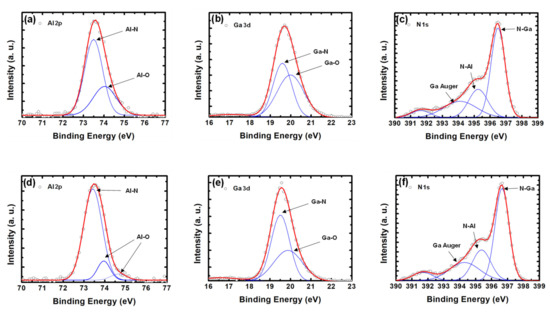 XPS fitting results of the Al 2p, Ga 3d, and N 1s peaks for the AlGaN samples fabricated using the digital etching (a–c) and ALE (d–f) processes.