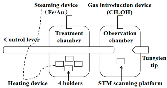 CH3OH, Au, and Fe atoms were adsorbed, streamed, and observed by a scanning tunneling microscopy (STM) system (JEOL Ltd., Akishima-shi, Japan). As shown in Figure 1, STM experiments were implemented in the observation chamber with a base pressure of 1 × 10−8 Pa, while the vacuum degree was below 4 × 10−8 Pa in the treatment chamber. The treatment chamber was equipped with 4 holders, which could be used to handle four samples simultaneously. In our experiments, the specific procedure was as follows.