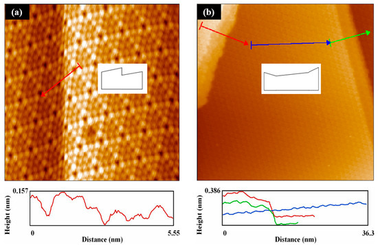 Scanning tunneling microscopy images of the step region on the Si (111)-(7 × 7) reconstructed surface. Each measurement is marked with different colors (red, green, and blue): (a) a cliff structure of the step region, the height difference of which is below 0.1 nm; (b) a basin structure of the step region, the height difference of which is more than 0.2 nm.