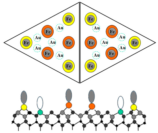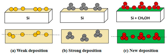 Typical models of strong and weak deposition have been proposed. The interaction between the Au and Si atoms is presented as a weak interaction, forming a weak deposition. In contrast, Fe deposition is regarded as a strong type, which can easily form Fe–Si and Fe–Fe bonds [11,16]. After a series of classification models were created, the focus became how the atomic structure would respond to surface potential energy changes, especially in the induction process. Additionally, to adjust the induced effect influenced by the step region properly, CH3OH was selected as an intermediate layer [16,17,18]. From a macro perspective, the step region or CH3OH adsorption could be explained as an amplification/reduction effect between metal and Si atoms [19]. Recent studies have shown that some regular atomic structures can be achieved if the surface potential energy is adjusted instead of the material composition [20,21].