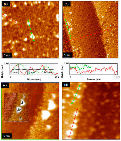Preferentially, metal atoms were directly deposited on the Si (111)-(7 × 7) surface, where the atomic structure could be observed in a relatively low concentration. In this study, Au and Fe atoms were taken as two typical deposition types to scan and compare. On the flat region of the Si (111)-(7 × 7) surface, Au atoms were deposited on the deeper position (Figure 3) without forming an Au–Si bond. The interaction among Au atoms was also weak, showing uniform distribution in Figure 4a. The new phenomenon on the step region (Figure 4b) was significantly different from this situation, which showed that most Au atoms began to form a linear structure. Moreover, as the deposition time increased, more linear atomic structures that were perpendicular to the boundary line were found. With the growth in each linear structure, although some scattered Au atoms were also found, the number of which was relatively small. Through these interesting phenomena, it can be inferred that the interaction among the Au atoms was induced on the step region of the Si (111)-(7 × 7) surface. In contrast to the Au atoms, the Fe atoms were usually deposited on the corner/center sites of the Si (111)-(7 × 7) surface (Figure 3). In Figure 5a, several Fe cluster structures are randomly formed on the flat region of the Si (111)-(7 × 7) surface, forming both Fe–Si and Fe–Fe bonds. In Figure 5b, Fe atoms begin to deposit along the boundary line of the flat and step region. At the same deposition condition, the size of the Fe cluster structure on the step region was larger than that of the flat region (Figure 5c). Once again, this typical phenomenon verified the induced effect of the step region. By continuing to increase the deposition time (Figure 5d), more Fe cluster structures were found along the boundary line.