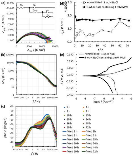 EIS measurements were performed after 1, 5, 10, 15, 20, 24, 36, 48, 60, and 72 h of immersion in the 3 wt.% NaCl solution containing 1 mM MMI (Figure 2a–c) in order to check the time dependence of the corrosion inhibition effectiveness of MMI. The obtained EIS data were fitted using different equivalent electrical circuits (EECs), including the EECs models possible for the present system of the corrosion inhibitor molecules adsorbed on the metallic material. The goodness of the fitting procedure was checked with χ2 (the lower the χ2 value, the better the fit). The best EEC model was determined to be RΩ(Rpore(Qsl(RctQdl))), which demonstrates the oxidized metallic surface covered with a corrosion inhibitor surface layer, with some pores filled with solution. RΩ stands for the uncompensated resistance, Rct for the charge transfer resistance, and Rpore for the resistance inside the pore of the corrosion inhibitor surface layer, where the electrolyte composition is different compared to the bulk solution. Qsl stands for the constant phase element (CPE) related to the surface layer and Qdl for the CPE of the double layer. The sum of Rpore and Rct represents the polarization resistance Rp. The Rp value is a measure of how the metallic material resists transferring the electron to the electroactive species in solution. The higher this value is, the more resistance to general corrosion occurs.