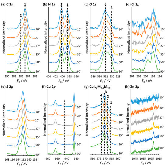 High-resolution (HR) angled-resolved (AR) XPS spectra of (a) C 1s, (b) N 1s, (c) O 1s, (d) Cl 2p, (e) S 2p, (f) Cu 2p, (g) XPS‑excited Auger Cu L3M4,5M4,5, and (h) Zn 2p.
