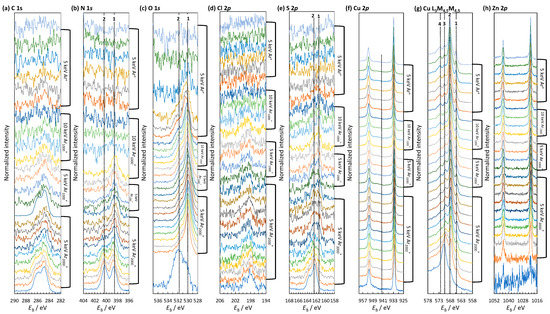 Spectra measured during depth profiling using gas cluster ion beam (GCIB) and monoatomic Ar+ sputter beams for (a) C 1s, (b) N 1s, (c) O 1s, (d) Cl 2p, (e) S 2p, (f) Cu 2p, (g) XPS‑excited Auger Cu L3M4,5M4,5, and (h) Zn 2p. The lowest spectra represent HR XPS measurements before sputtering.