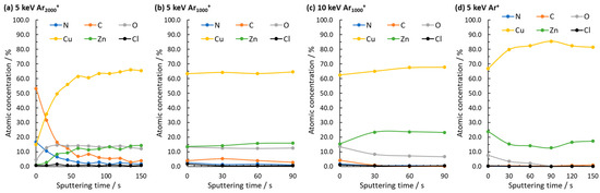 The change in atomic concentration during depth profiling using different sputter beams: (a) 5 keV Ar2000+, (b) 5 keV Ar1000+, (c) 10 keV Ar2000+, and (d) monoatomic 5 keV Ar+.