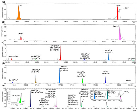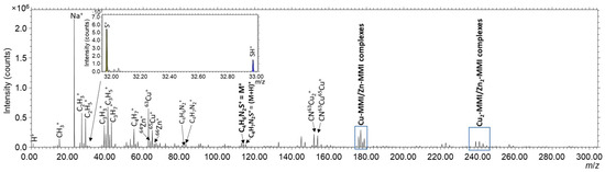 Cu and Zn each have two main isotopes, i.e., 63Cu, 65Cu, 64Zn, and 66Zn. Therefore, the formation of various organometallic complexes can occur. Such combinations are designated in Figure 9c–e. The signals for the organometallic complexes appear at m/z for (M-2H)X+, (M-H)X+, and M-X+, where X is 63Cu or 65Cu, or 64Zn or 66Zn. Moreover, the organometallic complexes are usually also comprised of two metal atoms to form ToF-SIMS signals at m/z for (M-2H)X2+, (M-H)X2+, and M-X2+. Furthermore, mixed organometallic complexes with one Cu and one Zn ion can also occur. The abovementioned possible species formation makes ToF-SIMS analysis difficult due to the possible spectral interferences (which would occur if these species were present simultaneously on the surface, as designated in Figure 9c–e, where for the same signal multiple components are possible, as seen in Table 1).