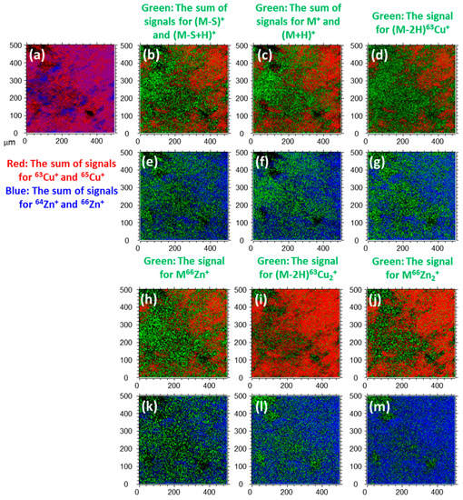 The distribution of Cu and Zn elements in the brass substrate is shown in Figure 10a. Before the overlay figure was constructed, the signals were normalized to the total ion image. The surface is mainly covered with MMI molecules (Figure 10b,c,e,f) and MMI-Cu/Zn complexes (Figure 10d,g,h,k). Moreover, the brass sample surface contains lower amounts of the MMI-Cu2/Zn2 complexes (Figure 10i,j,l,m). On the other hand, a combination of all the species (MMI molecules, MMI-Cu/Zn, and MMI‑Cu2/Zn2 complexes) cover most of the brass surface.