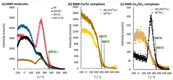 Figure 11a shows the characteristic signals for the MMI molecule, i.e., nonprotonated M+ and (M-S)+ and protonated (M+H)+ and (M-S+H)+. An initial increase in T (up to about 0 °C) resulted in the (M-S)+, (M+H)+, and (M-S+H)+ signals increasing and the signal for M+ becoming relatively noisy. The increase in the surface density of MMI-related species can occur due to the desorption of water molecules from the topmost position of the MMI-treated brass sample in that temperature range. A further increase in T in the range of 150–370 °C increased the signals for M+ and (M-S)+ (in Figure 11a) and also for M66Zn+ (in Figure 11c). The latter is explained by the desorption of the adventitious carbonaceous species that were adsorbed on top of the MMI surface layer, which increased the surface density of the species producing the M+, (M-S)+, and M66Zn+ signals. On the other hand, with the determined desorption T, as presented in Figure 11, the MMI-Cu complex desorbed first (at 310 °C, Figure 11b), followed by the MMI-Cu2 complex (at 330 °C, Figure 11c), the MMI-Zn2 complex (at 350 °C, Figure 11c), and the MMI-Zn complex (at 360 °C, Figure 11b). MMI molecules desorbed at 370 °C (Figure 11a). Therefore, it can be concluded that MMI-related species remain on the brass surface up to 310 °C, and with a further increase in T they start to desorb.