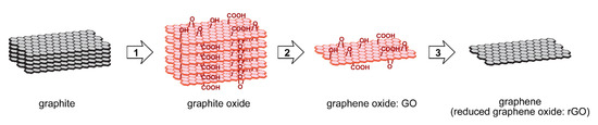 Synthetic route of graphene (reduced graphene oxide) through graphene oxide from graphite (1: oxidation, 2: exfoliation, 3: reduction).