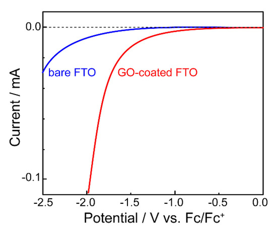 The electrochemical reduction of GO is generally carried out in aqueous electrolyte solutions, but since GO is water dispersible, it is necessary to immobilize GO on the electrode by prior chemical treatment [14]. We carried out the electrochemical reduction of GO in organic solvents, taking advantage of the fact that GO does not detach from the electrode in organic solvents as compared to aqueous systems [15]. For the electrochemical reduction of GO, platinum and indium–tin oxide (ITO) could be used as working electrodes, but the reduction reaction proceeded more effectively when fluorine-doped tin oxide (FTO), which can be applied in a wide potential window, was used. Figure 2 shows the linear sweep voltammetry (LSV) of the system using propylene carbonate (PC) as the organic solvent, tetraethylammonium tetrafluoroborate (Et4NBF4) as the supporting electrolyte, and FTO coated with a drop-cast film of GO as the working electrode. For comparison, the LSV data using only FTO without GO coating (bare FTO) as the working electrode are also shown. The reduction current flowed from around −0.5 V vs. Fc/Fc+, indicating that electrochemical reduction of GO is possible. When the applied potential became more negative than −1.0 V at LSV, the color of the film changed from brown to black, suggesting that GO was changing to rGO (Figure 3). Electrochemically reduced GO is henceforth referred to as “erGO”.
