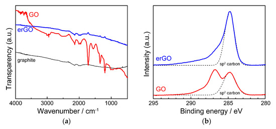 Fourier Transform Infrared (FT-IR) and X-ray photoelectron spectroscopy (XPS) were measured to identify the chemical structure of erGO (Figure 4). Although no significant absorption bands were observed in the raw graphite, absorption bands originating from C=O stretching vibration of the carbonyl group, angular vibration of the carboxyl group, and C–OH stretching vibration of the hydroxyl group were observed in GO powder at 1740, 1370, and 1220 cm−1, respectively. However, after the electrochemical reduction of GO, the characteristic absorption bands were no longer observed in the spectrum of the films as in graphite, suggesting that most of the oxygen-containing groups were removed by the electrochemical reduction. In addition, the C1s spectra in XPS showed that the signal derived from oxidized species in GO almost completely disappeared by electrochemical reduction. In order to investigate the electrical properties of erGO, the electrical conductivity of erGO films was measured by the four-probe method and found to be about 3 S cm−1, which is comparable to that of rGO obtained by chemical reduction with hydrazine.