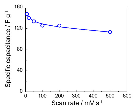 In addition to its high electrical conductivity, graphene has a large specific surface area of 2600 m2 g−1, which makes it promising as an electrode material for electric double-layer capacitors (EDLCs). EDLC is one of the electronic components used in a wide range of industries as a backup power source for integrated circuit (IC) and large-scale integration (LSI) memories and actuators. The sweep rate dependence of the specific capacity of EDLC prepared using erGO obtained by electrochemical reduction in propylene carbonate (PC) is shown in Figure 5. Although the rate of decrease in specific capacitance was about 20% compared to that at 10 mV s−1, it was found that the specific capacitance was maintained to some extent.