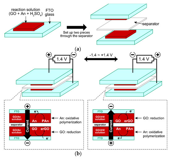 We have developed an easy method to fabricate alternating layered films of rGO and conducting polymers by taking advantage of the fact that conducting polymers can be easily synthesized by electrochemical oxidative polymerization and that the resulting polymer films are deposited on the electrode surface [18,19]. We focused on the fact that among conducting polymers, polyaniline (PAn) and polypyrrole (PPy) can be synthesized using relatively inexpensive and water-soluble aniline (An) and pyrrole (Py) as starting materials, and we developed an efficient method to fabricate alternating layered films by the following method using a two-electrode cell. GO aqueous dispersion containing sulfuric acid and An was cast on the FTO electrode and then sandwiched through the spacer (Figure 6a). In order to obtain PAn by electrochemical oxidative polymerization of An, the monomer An must be oxidized to generate cation radicals. However, if the resulting PAn is subjected to a high oxidation state (peroxidation state), it will degrade due to oxidative decay [20,21], so the applied voltage should be as low as possible. Therefore, optimization of the voltage applied to the cell was carried out. As a result, it was found that the lowest voltage at which PAn could be obtained was 1.4 V, so a voltage of −1.4 V~+1.4 V was applied between the two electrodes. On the other hand, GO is sufficiently electrolytically reduced at −1.4 V to produce erGO, but once GO is reduced to yield erGO, erGO is not re-oxidized back to GO at a voltage of about +1.4 V. Therefore, if a voltage of +1.4 V and −1.4 V is applied to both electrodes alternately, erGO and PAn are generated alternately on both electrodes, and two composite films are produced simultaneously (Figure 6b). It is also possible to fabricate composite films in which erGO and PAn are uniformly dispersed across each other by applying voltage in a scanning manner in this system. When PAn is oxidized, it incorporates the anionic moiety of the electrolyte in solution (doping), and when it is reduced, it releases the anion (de-doping). When the voltage is scanned, the doping/de-doping process smoothly takes place and the molecular chains of PAn can easily form a stable network. It can also be expected that the specific surface area of erGO will increase as PAn inserts between each layer of erGO sheets and props up each sheet.