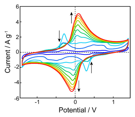 An example of the cyclic voltammogram (CV) of the erGO/PAn composite film obtained by this method is shown in Figure 7. The current flowing from around ±1.1 V is the oxidation current of An. The peak current at around ±0.26 V seen immediately after the start of the voltage scan is thought to be due to the redox reaction of quinone/hydroquinone groups, which is also seen in other carbon materials [22,23]. This peak current disappears after 50 voltage scans, suggesting that GO has been completely reduced and converted to erGO. The large peak current at around 0 V is the redox wave of PAn that continues to be generated on the electrode. The behavior of the CV curves indicates that the electrochemical oxidation of An acts as well as the electrode reaction of the counter electrode when GO is electrochemically reduced to produce erGO. When voltage was applied to the solution containing only GO without An, almost no current was observed and the electrochemical reduction of GO did not proceed.