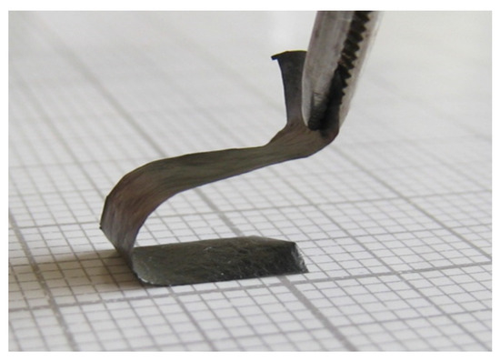 The brittleness of the resulting erGO/PAn composite film was reduced due to the uniform dispersion of PAn between the erGO sheets, and the film was easily peeled off from the FTO electrode to obtain a self-standing film. The film was flexible and could be bent or folded at sharp angles (Figure 8). It can also be cut out into any desired shape. These characteristics are beneficial properties when considering practical applications (especially wearable devices). The electrical conductivity of the composite film was 70 S cm−1, which is significantly higher than that of erGO film (3 S cm−1) and PAn nanofiber film (2 S cm−1) [24].
