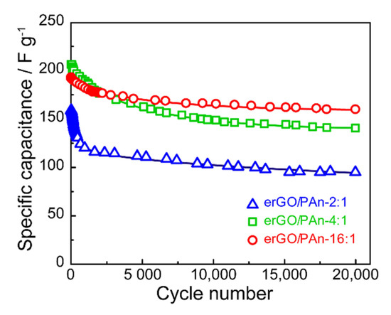 The capacitance of EDLC with the obtained erGO/PAn composite film was significantly affected by the mass ratio of GO and An in the reaction solution (GO:An ratio), and the highest capacitance of 205 F g−1 was obtained when the GO:An ratio was 4:1 (H2SO4 concentration: 2.0 mol dm−3). EDLCs using erGO/PAn composite films obtained from the reaction solutions with different GO:An ratios (2:1, 4:1, and 16:1), denoted as erGO/PAn-2:1, erGO/PAn-4:1, and erGO-PAn-16:1, respectively, were repeatedly charged and discharged under the same voltage scanning conditions as in Figure 7, and their cycle life was investigated (Figure 9). At the beginning of the cycle, their capacities were 159 F g−1 for erGO/PAn-2:1, 206 F g−1 for erGO/PAn-4:1, and 193 F g−1 for erGO/PAn-16:1. The capacities of all of them decreased slightly by repetition of charging and discharging. Further charge–discharge cycles were repeated, and when the number of cycles exceeded 3000, the capacity became constant regardless of the number of cycles. Even after 20000 cycles, the capacities of erGO/PAn-2:1, erGO/PAn-4:1, and erGO/PAn-16:1 remained at 95 F g−1, 141 F g−1, and 160 F g−1, respectively, all showing a good cycle life.