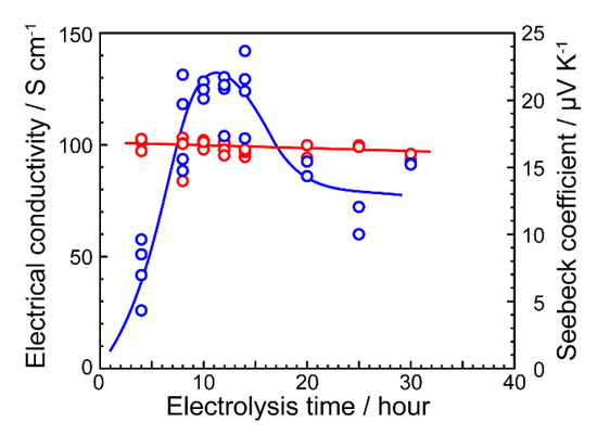 Two methods of fabricating composite films were investigated: (1) the potential scanning method, where a voltage is applied in a triangular wave in the range of ±1.4 V and (2) the potential stepping method, where two potentials of +1.4 V and −1.4 V are applied alternately. Two types of substrates, FTO and stainless steel (SUS), were investigated for the working electrode. It was found that the thermoelectric properties of the resulting composite films were significantly affected by the combination of these factors. Among them, the composite film prepared by the potential step method using an SUS plate as the working electrode showed the highest thermoelectric performance. The thermoelectric properties of the composite films were also found to be affected by the electrolysis treatment time, and the electrical conductivity started to increase rapidly after 5 h of treatment and reached its highest value after about 10 h (Figure 10). However, when the electrolytic treatment time exceeded 15 h, the electrical conductivity began to decrease. This was attributed to the peroxidation of PAn caused by the prolonged electrolytic treatment. On the other hand, the Seebeck coefficient did not change significantly with the electrolysis time. As a result, the power factor was also affected by the large change in electrical conductivity and showed the highest value around 10 h of electrolysis treatment time. In general, the thermal conductivity of graphene alone is very high, 3000 W m−1 K−1, which works as a disadvantage to reduce the ZT value. However, by compositing with PAn, which has a relatively low thermal conductivity of 0.1~0.3 W m−1 K−1, the thermal conductivity of the composite films could be reduced to 0.05~0.85 W m−1 K−1, resulting in a maximum ZT value of 0.024 for the composite films.