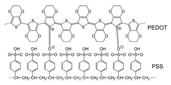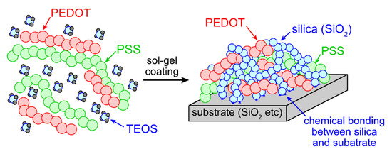 When extremely thin graphene films are applied to glass substrates, transparent conductive films can be produced due to the excellent electrical conductivity and transparency of graphene. However, graphene is brittle and does not adhere well to the glass substrate, which causes the problem of graphene detaching from the glass substrate after long-term use. We have previously reported that when tetraethyl orthosilicate (TEOS) is added to an aqueous dispersion of a commercially available conducting polymer, a composite of poly(3,4-ethylenedioxythiophene) and poly(4-styrenesulfonic acid) (PEDOT:PSS, Figure 11), the water and acid (sulfonic acid in PSS) cause a sol–gel reaction of TEOS to form a composite of PEDOT:PSS and silica. The resulting silica can adhere to the surface of the glass substrate through chemical bonds (Figure 12), and we have succeeded in developing transparent conductive films with excellent mechanical properties such as scratch hardness and adhesion strength [36]. In addition, while this film has excellent transparency in the visible light range, it has high absorption of near-infrared light. Therefore, it is highly expected that this feature can be used to make this film applicable to heat-shielding materials [37].