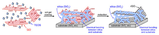 Since GO is obtained by oxidizing graphite under acidic conditions and exfoliating it in water and the product contains many acidic functional groups such as hydroxyl and carboxyl groups, the aqueous dispersion of GO can be obtained in an acidic state. Hence, it is expected that the GO acidic aqueous dispersion with these characteristics can be used to achieve the following: when TEOS is added to the GO acidic aqueous dispersion, the sol–gel reaction proceeds simply by mixing, and the GO/silica composite film can be obtained by coating the resulting solution on a substrate. Finally, the GO/silica film is annealed in air or a vacuum to produce the graphene/silica composite film (Figure 14). If the substrate is a metal oxide such as silica glass or ITO, the graphene/silica composite film can be strongly fixed to the substrate via chemical bonding due to the dehydration condensation between the hydroxyl groups on the substrate surface and the silanol at the end of the molecular chain of silica in the film. Based on this idea, graphene/silica composite films were synthesized by the following method [48,49]: TEOS was added to the GO acidic aqueous dispersion in the proportions shown in Table 1 and stirred for 12 h at room temperature. A phase separation between TEOS and GO aqueous dispersion was observed immediately after TEOS was added to the GO acidic aqueous dispersion. However, the solution became homogeneous (sol state) as the reaction progressed and hydrophilic silanols were formed. The resulting mixed solution was spin-coated onto a glass or quartz substrate and subjected to thermal reduction (reduction conditions: 300 °C in air, 300 °C in a vacuum, 500 °C in a vacuum, and 800 °C in a vacuum) to produce a composite film of thermally reduced GO (“trGO”) and silica. Among the films prepared by the feed ratios shown in Table 1, GS27 with the highest silica content was visually confirmed to be inhomogeneous, probably due to phase separation between trGO and silica. Therefore, further investigations were performed only for the composite films with a silica content less than 23 mol % (trGO~GS23).