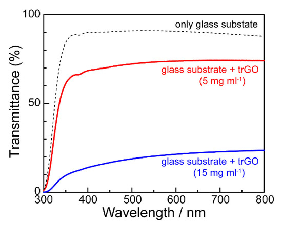 Transmission spectra of trGO films on slide glasses prepared with GO solutions of 5 mg mL−1 (red) and 15 mg mL−1 (blue). The dotted line denotes the transmission spectrum of the slide glass itself.