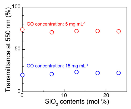Transmittances of trGO/SiO2 films at 550 nm plotted against silica contents for GO = 5 mg mL−1 (red) and 15 mg mL−1 (blue).