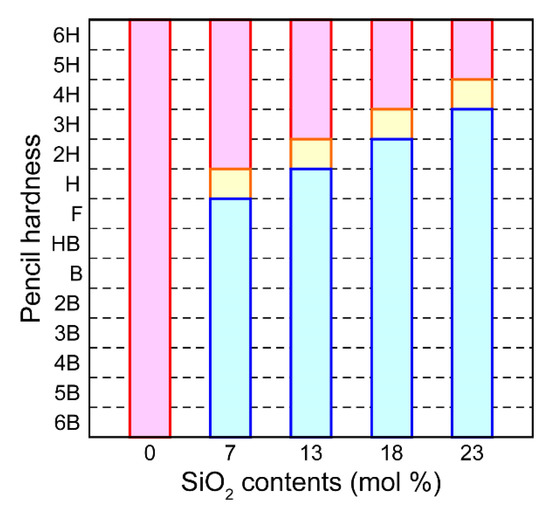 Pencil hardness test of trGO and trGO/SiO2 films prepared at 800 °C. (Red: cohesive fracture, Yellow: plastic deformation, and Blue: no damage)