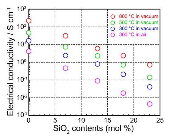 Electrical conductivities of trGO and trGO/SiO2 films as a function of the silica content.
