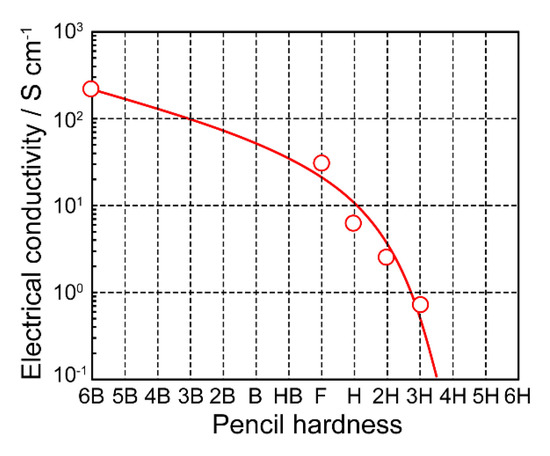 First, we investigated the effect of the concentration of GO water dispersion on the transparency of the films (Figure 15). As a result, the transmittance of the film prepared using the solution with a GO concentration of 5 mg mL−1 was maintained at about 80% of that of the glass substrate alone, indicating that the film had relatively high transparency. Next, the effect of the silica concentration in the films was investigated, and it was found that the transmittance of the films was not significantly affected by changes in the composite ratio of trGO to silica (Figure 16). The mechanical strength of the films was evaluated using a pencil scratch hardness tester [50], and it was confirmed that the films of trGO alone peeled off when scratched with pencils of all harnesses in the range of 6B~6H. On the other hand, the strength of the trGO/silica composite film increased as the silica content and the annealing temperature of the film increased, and GS23 fabricated at 800 °C in a vacuum showed no damage to the film even when scratched with a 3H hardness pencil (Figure 17). The electrical conductivity of the films was evaluated, and it was found that the electrical conductivity tended to decrease as the silica content in the film increased, while it tended to increase as the heat treatment temperature of the film increased (Figure 18). The correlation between the strength of the films and the electrical conductivities was investigated and it was found that the optimum relationship between the strength and the electrical conductivity was established in the case where the scratching strength of the film was F and the electrical conductivity was 32 S cm−1 (Figure 19).