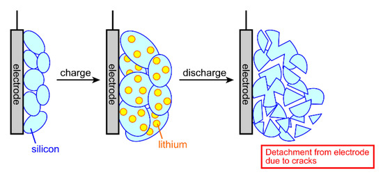 From this equation, the theoretical capacity of carbon materials such as graphite as the anode material is 372 mAh g−1. Currently developed LIBs have already achieved values close to this theoretical capacity, and the development of new materials with higher capacity is eagerly awaited in order to expand their applications to large devices such as electric vehicles and energy storage systems. Silicon (Si) is an anode material that is currently attracting attention from this viewpoint [55,56,57,58]. The use of Si can be expected to provide a high theoretical capacity (4198 mAh g−1) based on Equation (3).