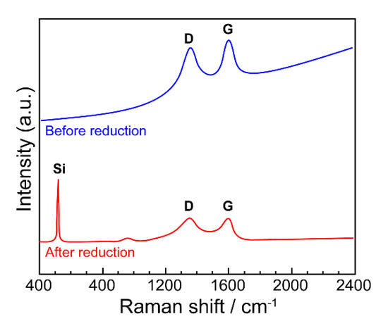 In order to evaluate the structure of the obtained product, Raman spectroscopy was performed (Figure 21). In the spectrum of the sample before heat treatment, the D band derived from structural defects around 1350 cm−1 and the G band derived from the six-membered ring structure around 1600 cm−1, which are observed in graphite and graphene, were observed. On the other hand, in the spectrum of the product annealed in the presence of Mg, a sharp peak derived from Si was newly observed at around 520 cm−1. These results suggest that silica in the GO/silica composite can be reduced to Si by heat treatment in the presence of Mg.