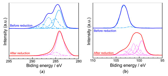 XPS measurements were also performed to analyze the composition of the composite (Figure 22). The C1s spectra showed that the signals derived from sp3 carbon (285 eV) and the oxygen group (286~288 eV) in GO almost disappeared, and the signal intensity derived from sp2 carbon (284.3 eV) increased in the composite obtained by annealing in the presence of Mg. The Si2p spectrum showed that only one signal derived from silica was observed around 103.5 eV in the GO/silica spectrum, but when the composite was heated in the presence of Mg, the intensity of this signal was greatly reduced and new signals derived from Si (99.5~99.8 eV) and partially oxidized silicon (SiOx, 0 < x < 2, 100.1~102.0 eV) were observed. These results indicate that both GO and silica could be reduced by heat treatment in the presence of magnesium, although not completely. The composite obtained by the magnesiothermic reduction is hereafter referred to as “mrGO/Si”.