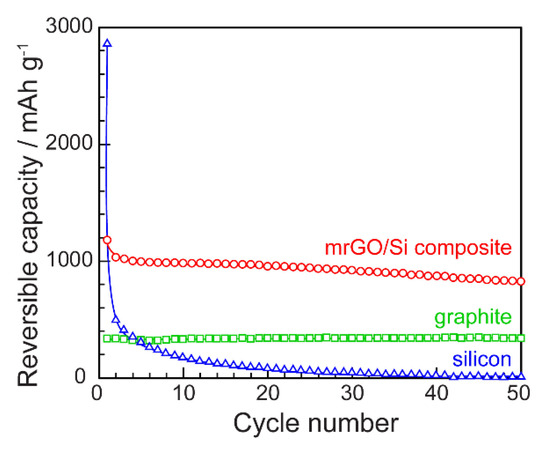 A battery using the obtained mrGO/Si composite as the anode material was fabricated and its charge–discharge characteristics were investigated. The initial capacity of the LIB fabricated with the mrGO/Si composite film was lower than that of the battery fabricated with silicon alone, but about four times higher than that of the battery fabricated with graphite. We also found that the cycle stability of LIB with mrGO/Si composite was superior to that of LIB with silicon (Figure 23).