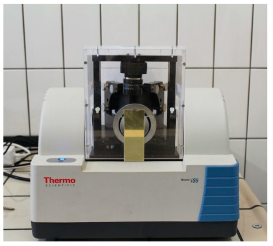 All samples were analyzed with a ThermoFischer Scientific Nicolet iS 5 FTIR spectrometer (ThermoFischer Scientific, Waltham, MA, USA) in reflectance mode. Spectra were collected using 128 scans at 4 or 8 cm−1 resolution, measuring between 4000 and 650 cm−1. A custom-made external module was used to be able to compare the coupons spectra with those obtained from museum objects analyzed with the same configuration (Figure 1). Coupons varnished with recipe 8V were also analyzed with a benchtop ThermoFischer Scientific Nicolet iN 10 MX FTIR microscope (ThermoFischer Scientific, Waltham, MA, USA) with the same collection parameters in order to have better spectral response.