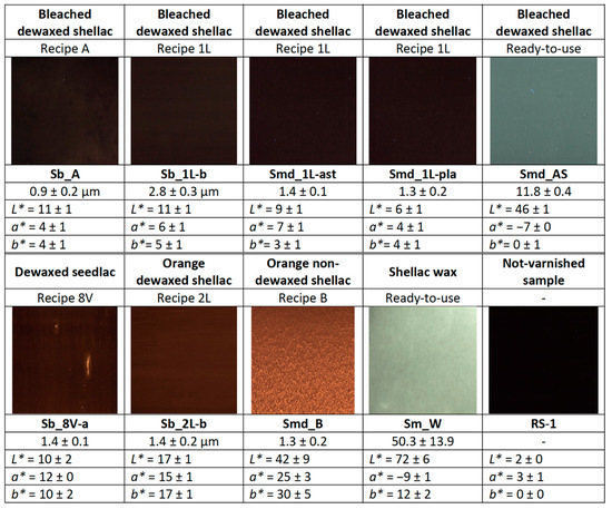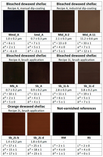 Various varnish recipes were selected based on extensive bibliographic research from a repertory of over 100 recipes [5]; all selected varnishes are shellac-based because of their high occurrence in the 19th century literature; ethanol was used as solvent for the same reason. Different grades of shellac were chosen for comparison (Table 2), namely bleached dewaxed shellac in flakes, orange shellac in flakes (both with wax and dewaxed), and dewaxed seedlac in grains by Kremer Pigmente, as well as three industrial bleached dewaxed shellac products, i.e., “Astra” from Laverdure (in flakes), “Astra” from Boesner (liquid), and “Platina” from Laverdure (in flakes). In addition, a sample of pure shellac wax from Kremer Pigmente was created by melting the wax directly on the coupon on a hot plate.