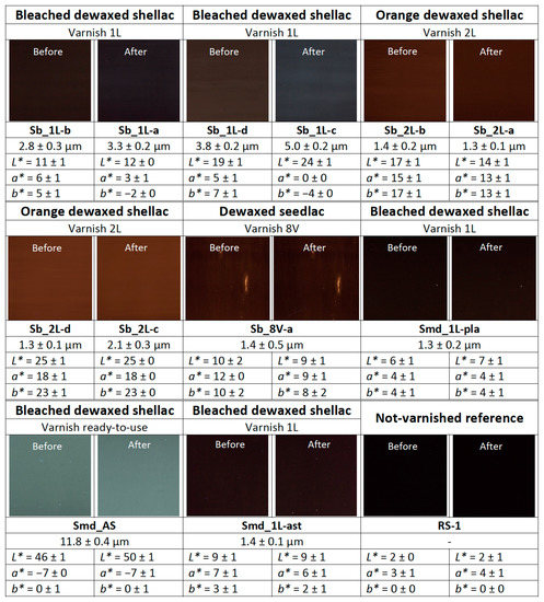 Figure 2 shows the fluorescence under UV light and the L*a*b* colorimetric coordinates of the different types of shellac varnishes, the shellac wax, and the not-varnished sample. Samples Sb_A, Sb_1L-b, Sb_8V-a, and Sb_2L-b were varnished by brush, whereas varnish on samples Smd_1L-ast, Smd_1L-pla, and Smd_AS was applied by manual dip-coating.