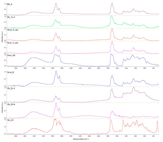 Figure 5 shows the FTIR spectra of the representative samples of each varnish recipe: samples Mb_A (recipe A), Sb_1L-d (recipe 1L), Smd_1L-ast (“Astra”), Smd_1L-pla (“Platina”), and Smd_AS (“Astra”, ready-to-use) for bleached dewaxed shellac; samples Smd_B (recipe B) and Sb_2L-d (recipe 2L) for orange shellac; sample Sb_8V-b (recipe 8V) for seedlac; Sm_W for shellac wax.