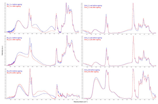 FTIR spectra of the samples before (blue spectra) and after (red spectra) ageing. On the left, from top to bottom: Sb_1L-c, Sb_2L-c, Sb_8V-b (and Sb_8V-a); on the right, from top to bottom: Smd_1L-ast, Smd_1L-pla, Smd_AS.