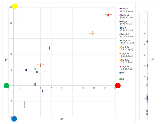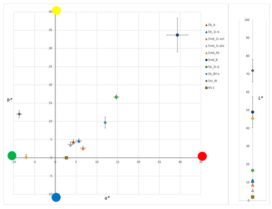 L* a* b* colorimetric coordinates of the varnishes’ fluorescence under UV light before (■) and after (⬤) ageing (cf. Figure 4).