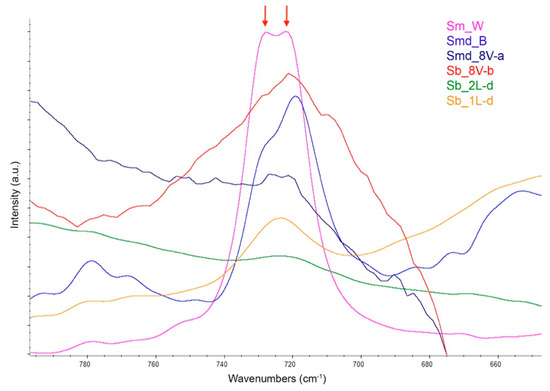As by UV imaging, it is possible to detect by FTIR the presence of wax in the varnish, appearing as a characteristic double peak at 730 and 720 cm−1 [27] (p. 107), [28] (pp. 100–102); these peaks are indeed visible in the non-dewaxed orange varnish B (sample Smd_B) and in shellac wax (sample Sm_W), as well as, partially, in the manually dewaxed shellac varnish 8V (samples Sb_8V-a and Sb_8V-b), which clearly still contains traces of wax (Figure 9). Wax was instead more efficiently manually removed in varnishes 1L and 2L (samples Sb_1L-d and Sb_2L-d).