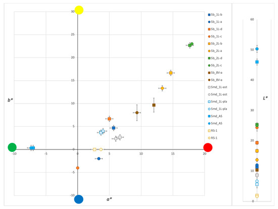 Plotting the L* a* b* coordinates of the UV fluorescence of the samples before and after ageing (Figure 12, cf. Figure 4) it is possible to see that no change is noticeable for the industrially dewaxed bleached shellac samples with weak fluorescence (Smd_1L-ast and Smd_1L-pla), whereas a slight increase in lightness is found for the thicker and more fluorescent sample Smd-AS. This might be due to the fact that slight changes in hue and lightness are more difficult to detect in case of low fluorescence. On the other hand, samples coated with the manually dewaxed varnishes 1L, 2L, and 8V show a shift towards bluish-greenish hues with ageing, with the exception of the orange shellac applied in two layers (sample Sb_2L-c/-d). The difference is higher for less fluorescent bleached shellac varnish 1L, with ∆E values of 12.8 (Sb_1L-c/-d) and 7.1 (Sb_1L-a/-b), and lower for the more fluorescent unbleached shellac varnishes 2L and 8V, with ∆E values of 4.7 (Sb_2L-a/-b) and 3.6 (Sb_8V-a). It needs to be noted that, as explained in Section 3.2, it was not possible to compare the same sample before and after ageing for varnishes 1L and 2L, which might partially affect the difference in hue of these samples. More research needs to be done on a larger set of samples in order to confirm these preliminary results.