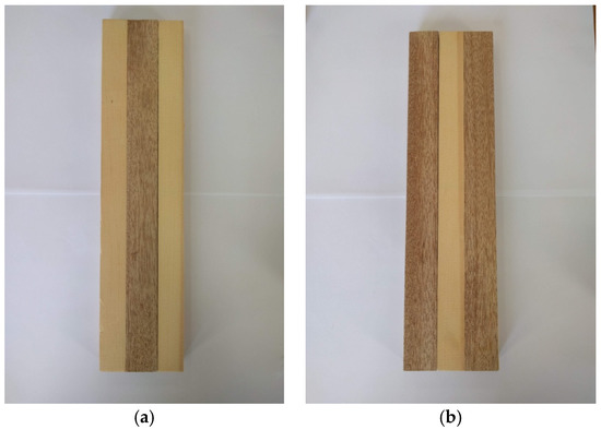 Types of laminated wood; fir in surface layers and meranti in core (FMF—a) and meranti in surface layers and fir in core (MFM—b).