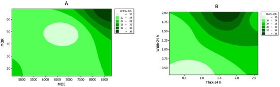 Contour plots between physical and mechanical properties of three-layer laminated wood made from fir and meranti wood (A: MOR = modulus of rupture; MOE = modulus of elasticity; and B: WA = water absorption; Width and Thick-24 h = width and thickness swelling after 24 h immersion in water).