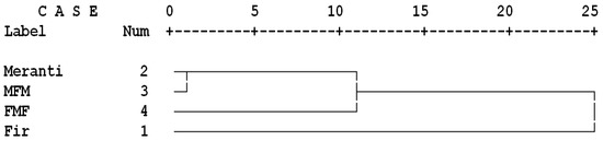 Cluster analysis was carried out for four treatments, and based on all the physical and mechanical properties studied here. The properties included water absorption, longitudinal, width, and thickness swelling, as well as modulus of rupture, modulus of elasticity, and thermal transmittance coefficient. The four treatments consisted of the two laminated wood (MFM and FMF), along with the values of the two solid wood species of “fir” and “meranti”. This statistical analysis revealed that two treatments of meranti solid wood and MFM laminated wood were connected by a vertical line at about number "one" on the scale bar (on top of the graph) (Figure 5). This indicates that these two treatments are very similar based on all the properties studied here. Similar observations were reported by Hartono and Sucipto [13] who made three layer laminated wood from oil palm trunk in the core, a low quality raw material, and applied high density woods in the surface layers, namely sengon and meranti. Based on the similarity demonstrated between meranti solid wood and MFM laminated wood, it can be concluded that the potential applications of this engineered laminated wood (MFM) can be considered nearly the same as can be expected from the physical and mechanical qualities meranti solid wood. Using this engineered laminated wood, forests and woody resources can more efficiently be preserved and more practically be used for different applications. However, the cluster analysis illustrated that “fir” was connected at scale No. 25 with the other three treatments. This indicated that fir, as asolid wood, reacted quite differently, and it was to be considered as a material with completely different properties. Table 2 demonstrated that the mechanical properties of fir solid wood were significantly higher than those of meranti solid wood. The reason for the substantial decrease in the mechanical properties of FMF laminated wood can be elaborated from different perspectives. It was previously reported that shear strength and failure patterns in glue line were significantly dependent on the mechanical properties of the wood [35,36]. The cited authors explained that failure occurred in the glue line when shear strength of the wood used in the experiment was higher than that of the glue itself. However, if the mechanical properties of the wood were low, or thermal modification had made the woody parts weaker, failures occurred in the wooden parts [32,36,37]. In the present study, meranti wood had significantly lower mechanical properties in comparison to fir solid wood (Table 2). Therefore, MFM laminated wood were expected to be very similar to those of meranti solid wood, because fir was used in the core; that is, the neutral zone which is less important. However, fir solid wood had significantly higher mechanical properties; therefore, in FMF laminated wood, the failure occurred in the glue line and before the two fir wood layers on the top and bottom surfaces failed, it was the glue line that failed, resulting in a substantial decrease in the overall mechanical properties. The eventual outcome of the above mentioned facts resulted in close clustering of meranti solid wood with MFM laminated wood, as well as remote clustering of fir solid wood with FMF laminated wood. It was concluded that laminated wood with fir on the surface layers are not recommended with regard to their substantial decrease in mechanical properties, and significant increase in physical properties, when compared with values of fir solid wood specimens.