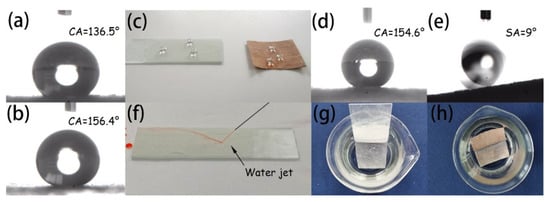 Inspired by the lotus leaf effect and rose effect, scientists discovered superhydrophobic surfaces. Superhydrophobic surfaces have a very wide range of applications due to their unique wettability, such as self-cleaning [1,2,3], liquid non-destructive transportation [4,5,6], drag reduction [7,8,9], corrosion resistance [10,11] and anti-icing [12,13], etc., which has caused widespread interest in the scientific community and industry. Artificial superhydrophobic surfaces have been fabricated by a variety of methods, including chemical vapor deposition [14,15], machining [16,17], femtosecond laser [18,19], lithography [20,21] and spraying [22,23] etc. The industrial application of superhydrophobic surfaces has been handicapped by the complex processing techniques, high-standard processing environments and expensive materials required. In addition, the fluorine-containing substances and acidic or alkaline solutions used in the preparation process cause serious environmental problems. Researchers have also found that the microstructure and chemical composition of superhydrophobic surfaces have a huge influence on their wettability, which changes with the microstructure on the surface [24,25]. The fragile nature of the microstructure can also be another obstacle for the application of superhydrophobic surfaces. Meanwhile in practical applications, a superhydrophobic surface is not always required on a flat surface, and maybe twisted or bent, for example, when the coated substrate is flexible, such as in the case of a fabric. Under external force, the substrate always deforms, causing damage to the microstructure and performance of the superhydrophobic surface. Therefore, to prepare a flexible superhydrophobic surface with a solid microstructure in a cheap and eco-friendly way can be crucial for the industrial production of the superhydrophobic surface.
