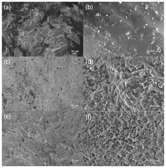 (a,b) SEM image of coating A. (c,d) SEM image of coating B. (e,f) SEM image of coating C.
