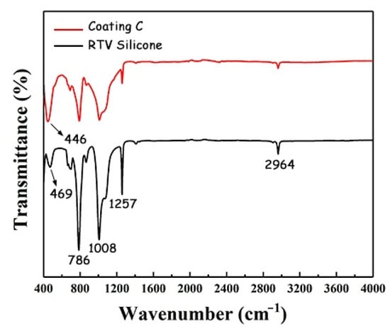 Figure 3 shows the typical vulcanization procedure of RTV silicone rubber. The vulcanization reaction between polydimethylsiloxane (the capping group is hydroxyl) and ethyl orthosilicate (cross-linking agent) is catalyzed by dibutyltin dilaurate (DBTDL) to produce RTV silicone rubber and ethanol. The chemical composition of the superhydrophobic coating is determined by FTIR. The FTIR spectra of coating C and the pure and cured RTV silicone rubber is shown in Figure 4. By comparing the FTIR spectra, it was found that their characteristic absorption peaks are basically the same, which proves that a vulcanization reaction occurred on the substrate and RTV silicone rubber is generated. The absorption peaks at 1257 and 2964 cm−1 are attributed to the skeleton vibration of the -CH3 group. The absorption peaks at 1008 and 786 cm−1 are attributed to the symmetric stretching vibrations of Si–O–Si, and the absorption peaks at 446 and 469 cm−1 are attributed to the bending vibrations of Si–O–Si.