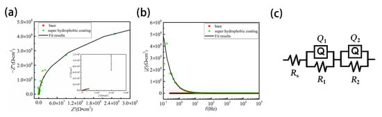 Corrosion resistance is one of the important characteristics of the superhydrophobic surface. Electrochemical impedance spectroscopy (EIS) is used to compare the difference between polished copper foil and copper foil with a superhydrophobic coating [29,30]. Referring to the test method of Zhu et al. [31], using an electrochemical workstation (CS2350H, Wuhan CorrTest Instruments Corp., Ltd., Wuhan, China), at room temperature, through a standard three-electrode system, the corrosion behavior of different samples in 3.5 wt.% NaCl aqueous solution was tested. It can be seen from the Nyquist spectra, that the radius of the capacitive reactance arc of the superhydrophobic coating is much larger than that of the bare copper (Figure 5a). The larger the radius of the capacitive reactance arc is, the greater the resistance is in the process of charge transfer. As shown in Figure 5b, the Bode spectra provides further evidence. The |Z| value of the superhydrophobic coating is eight orders of magnitude larger than that of the bare copper. To explain the corrosion resistance of the coating more intuitively, Table 2 shows the values of the components corresponding to the equivalent circuit diagram obtained by the fitting software (ZView 2, Solartron, West Sussex, UK), according to the equivalent circuit diagram in Figure 5c. CPE1 and CPE2 are artificially assumed to be alternatives for pure capacitive elements, and they are used to improve the results of the fitting. When the dimensionless index n is equal to 1, the constant phase angle element is pure capacitance. Rs and R1/R2 are solution resistance and charge transfer resistance, respectively. As shown in Table 2, the values of Rs, R1 and R2 of copper foil with superhydrophobic coating are far greater than the corresponding values of polished copper foil, which proves that the surface of the superhydrophobic coating is subject to greater impedance in the process of electron transfer than the polished copper foil. For metal substrates, the higher the electron transfer impedance is, the stronger the corrosion resistance of the metal is, confirming that the corrosion resistance of copper foil with superhydrophobic coating is greater than that of the polished copper foil. In other words, the superhydrophobic coating can effectively improve the corrosion resistance of the substrate.