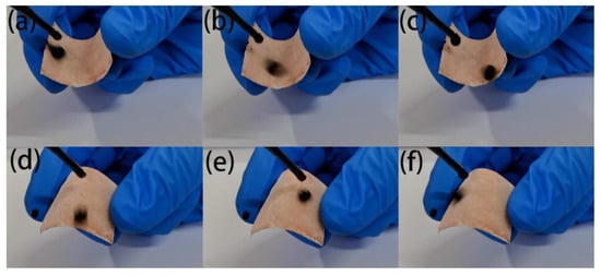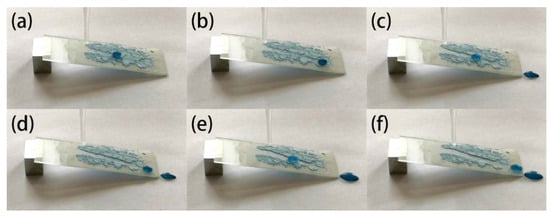 To study the self-cleaning effect of the coating, chalk dusts are sprayed onto the surface of the coating. As shown in Figure 9a–f, when dropped onto the surface of the coating, water droplets roll forward under the action of gravity. Part of the chalk dust is absorbed and leaves the surface along with the water droplets. With the increase in water droplets, more chalk dust is taken away from the sample surface, leaving a channel without chalk dust on the sample surface.