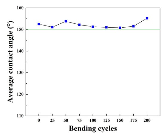Durability is an important criterion for evaluating whether superhydrophobic surfaces can be used in practice. Jia et al. synthesized PDMS-SiO2 nanoparticles through a high-temperature dehydration reaction and then prepared a super-hydrophobic coating, but this coating tends to fail in harsh environments [32]. In this study, we tested the durability of the prepared superhydrophobic coating through a series of experiments. In order to study the stability of the superhydrophobic coating when the substrate is deformed, a bending test was carried out on the copper foil with a superhydrophobic coating. As shown in Figure 6a–c, when the copper foil is bent to form a concave surface, the water droplet rolls off quickly on the sample surface. The same phenomenon occurs on the sample bent into a convex surface. Dripping from any position, water droplets immediately roll off from the sample surface (Figure 6d–f). To further investigate the stability of the sample, we first bend the sample into a concave surface and then a convex surface to form a cycle. After 200 cycles, the superhydrophobic surface is still fixed on the copper substrate, and the average contact angle of the surface remains above 150° (Figure 7).
