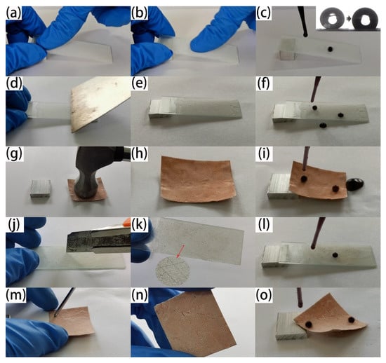 Mechanical durability test. (a–c) finger wiping test. The inset shows the change in contact angle of coating B after the same test. (d–f) putty knife scratch test. (g–i) hammer test. (j–l) utility knife cutting test. (m–o) screwdriver scratch test.